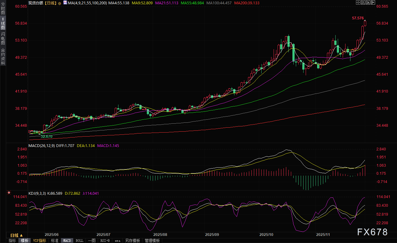 (现货白银日线图,来源:易汇通)北京时间9:03,现货白银现报57.49美元/盎司。