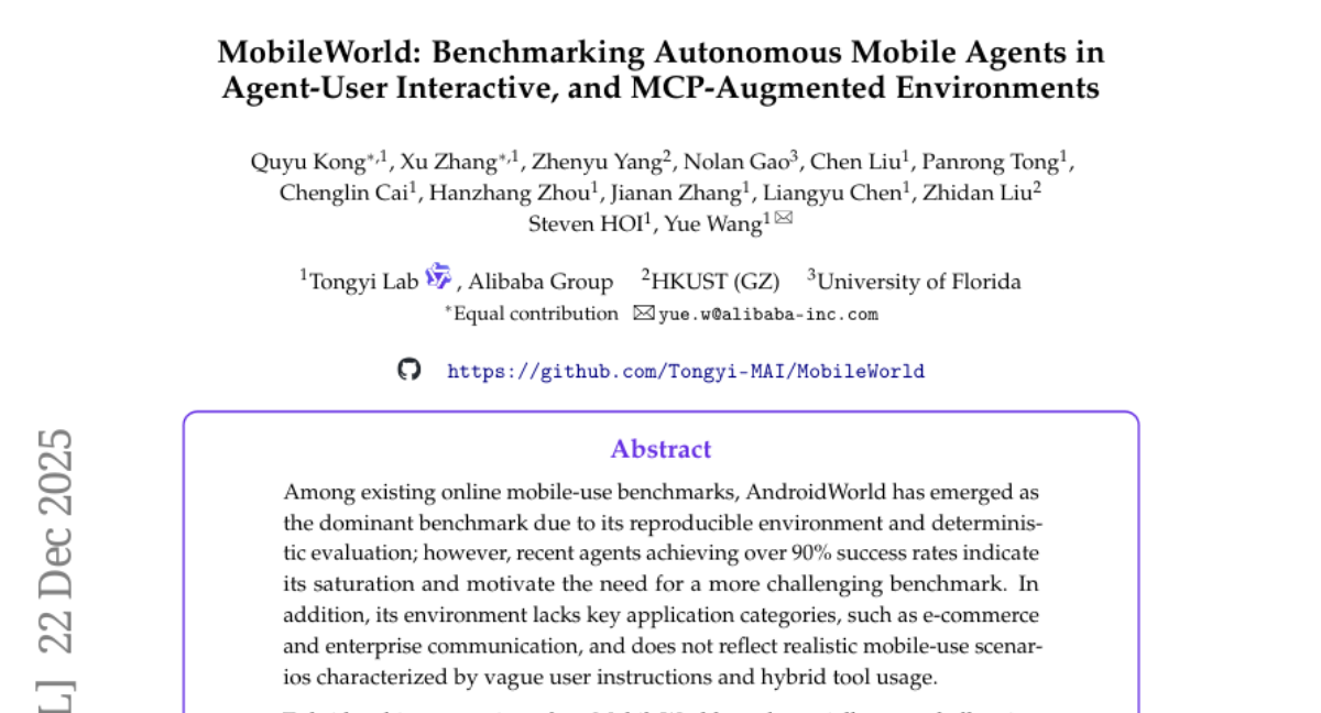 这项由阿里巴巴通义实验室的孔曲雨、张旭等研究人员联合香港科技大学(广州)和佛罗里达大学团队共同完成的研究,发表于2025年12月。研究团队开发了名为MobileWorld的全新测评平台,感兴趣的读者可以通过论文编号arXiv:2512.19432查询完整论文。