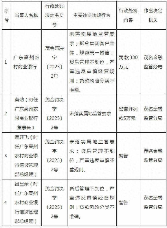 同时,时任广东高州农村商业银行董事长黄劲,因未落实属地监管要求,被警告并罚款5万元。