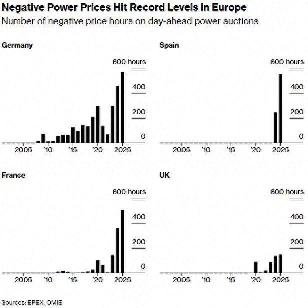 负电价现象凸显了欧洲可再生能源发电的快速增长与停滞的需求以及持续的电网限制之间的冲突。德国在2025年记录了573小时的负电价,较前一年增长了25%。而西班牙在2024年首次经历负电价后,其频率至今已同比翻倍。