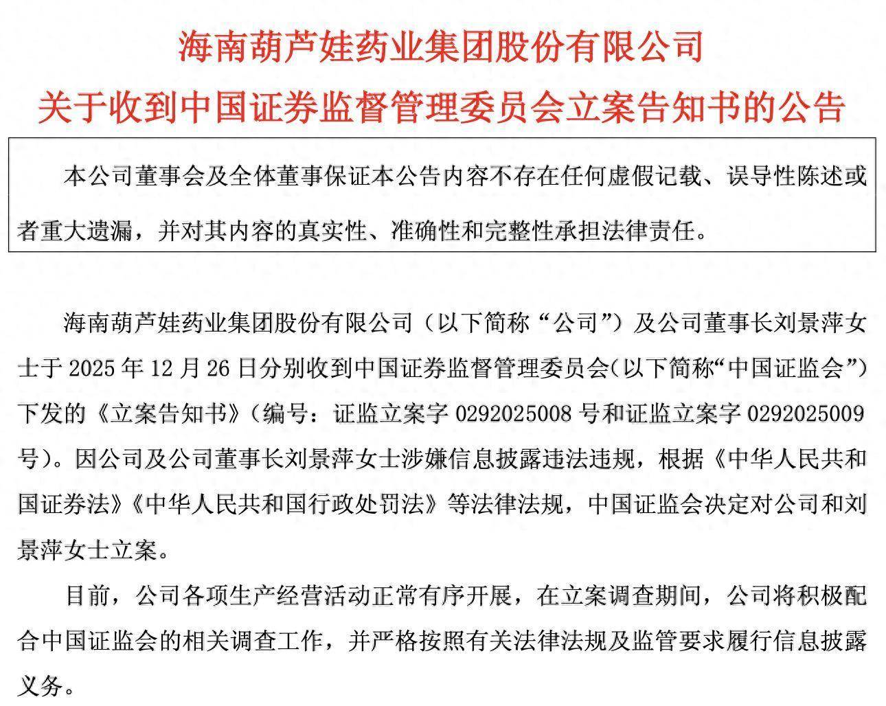 12月28日,ST葫芦娃(605199)公告,公司及董事长刘景萍于2025年12月26日分别收到中国证监会下发的《立案告知书》。
